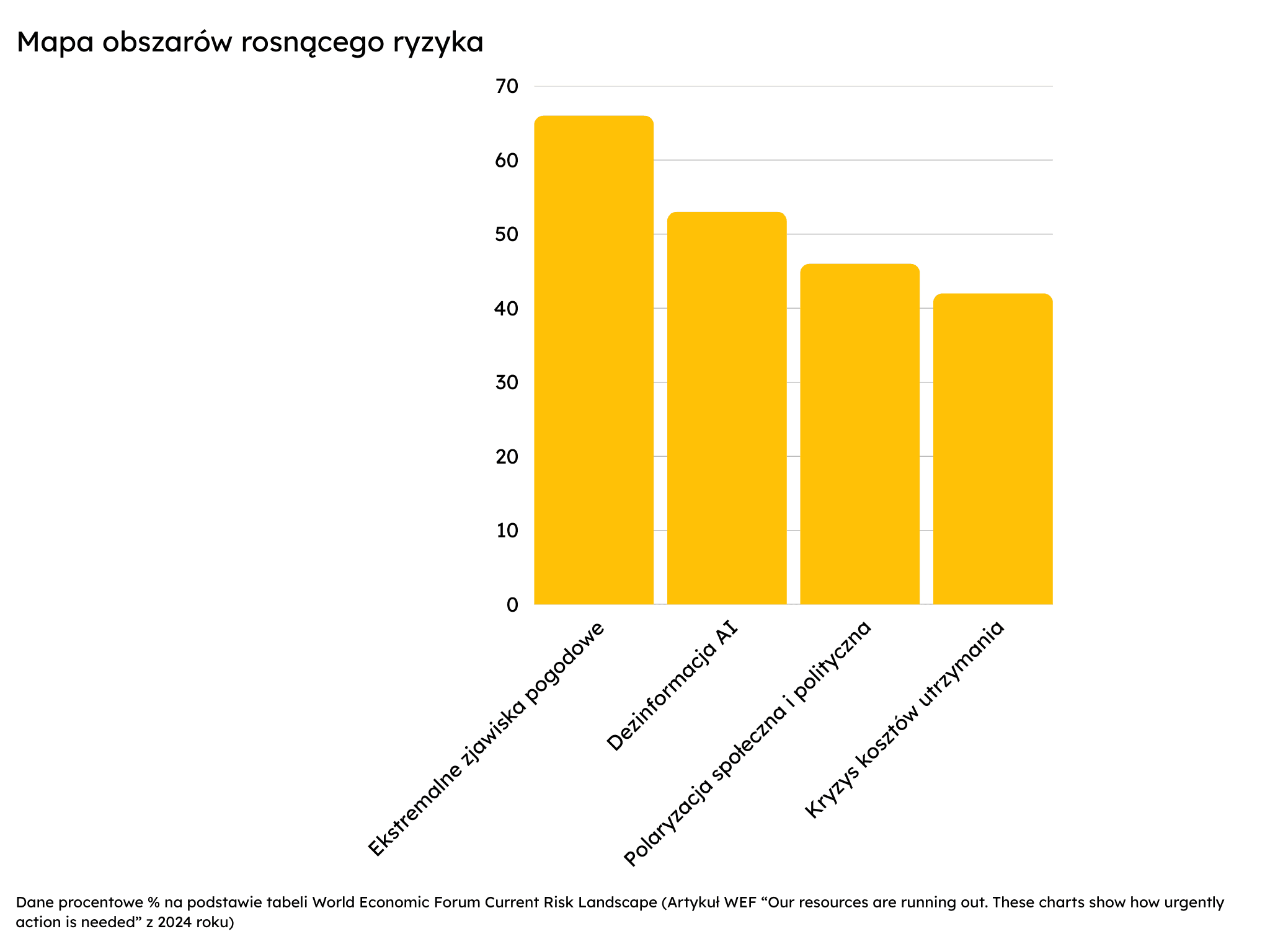 W jednym z artykułów World Economic Forum zamieszczono tabelę przedstawiającą mapę ryzyk, które przewiduje się w kolejnych latach. Poniżej zamieszczamy opracowanie własne.